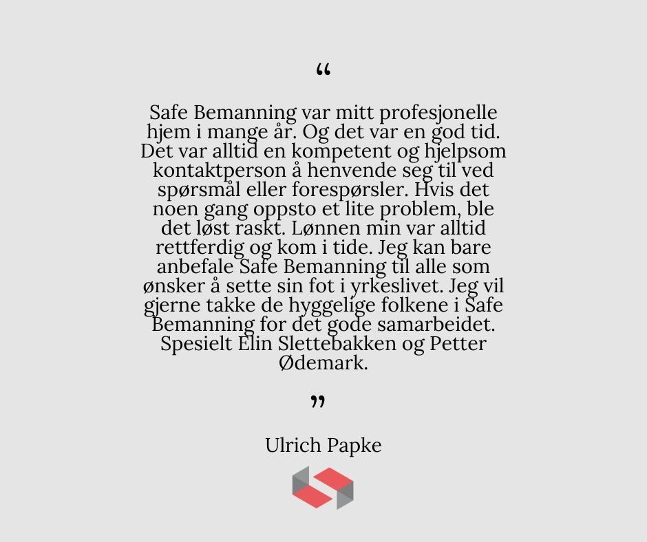 Vi ønsker å rette en spesiell takk til Ulrich Papke for hans utrolige innsats gjennom 9 år i Safe Bemanning. Gjennom årene har Ulrich vært en sentral drivkraft og en svært dyktig representant for vårt team. Hans dedikasjon, kunnskap og engasjement har bidratt til å styrke vår virksomhet og sikre gode resultater for våre kunder.